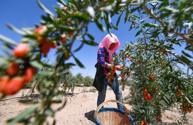 移民在宁夏吴忠市红寺堡区百瑞源原生态枸杞种植基地采摘头茬枸杞(6月5日摄)。