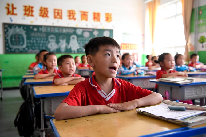 宁夏吴忠市红寺堡区红寺堡中心小学的学生在课堂上朗诵古诗(7月3日摄)。