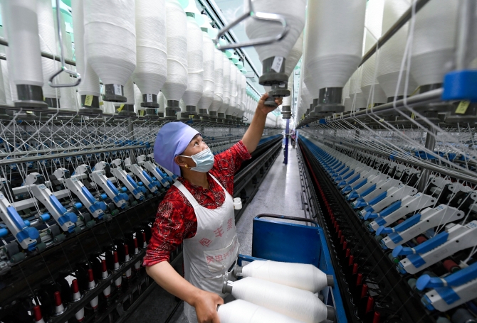 在宁夏吴忠市红寺堡区现代纺织产业园内,移民在生产线上忙碌(6月7日摄)。