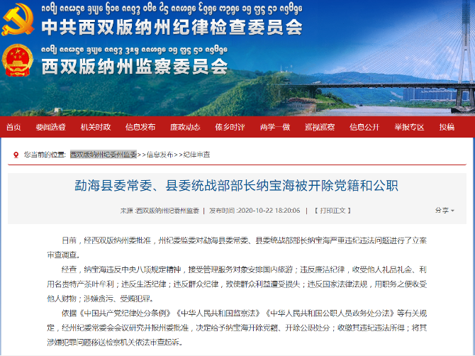 据西双版纳州纪委监委网站消息,日前,经西双版纳州委批准,州纪委监委对勐海县委常委、县委统战部部长纳宝海严重违纪违法问题进行了立案审查调查。