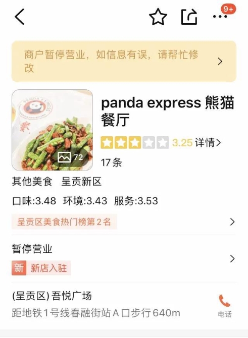 同样位于该吾悦广场的一位商户向记者透露,山寨“熊猫餐厅”暂停营业应该就是这两天的事情,最近他路过门店时还看到挂着试运营的牌子。