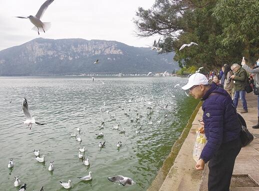 “太可爱了,太漂亮了!它们是从哪儿来的呀?”从四川到昆明旅游的唐先生第一次看到红嘴鸥。看到这些飞舞到岸边主动向市民“讨吃”的小可爱,唐先生也去买面包投喂。当听说这些红嘴鸥是从遥远的西伯利亚等地而来时,唐先生说:“它们真不容易。这道风景太美了,要好好保护。”说完,唐先生与红嘴鸥合了个影。其他游客看到红嘴鸥靠岸,也纷纷与它们合影。