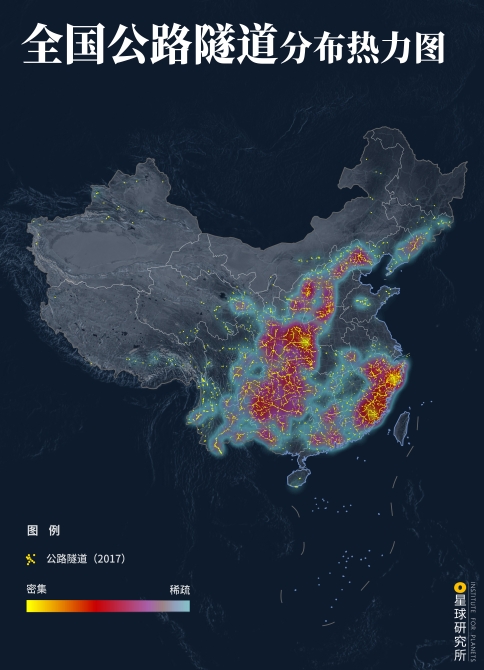 (本文仅讨论山区中的铁路和公路隧道,未涉及城市隧道和水下隧道。下图为全国公路隧道分布热力图,港澳台数据暂缺,制图@陈志浩&王申雯/星球研究所)