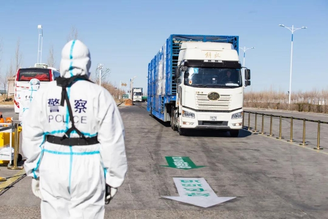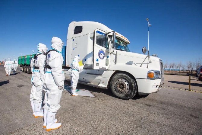 交接仪式结束后,跟着领路的警车,满载羊只的货车开始驶向我国二连浩特口岸。在经过通关证件查验,和车体检查完毕后,货车驶入口岸开设的“绿色通道”,前往位于二连浩特的隔离场。在这里,通关的活羊会接受进一步防疫检验,并在集中隔离12个小时后统一屠宰,整个屠宰过程将历时5天左右。在加工完毕后,羊肉会被直接送往捐赠地。其余的活羊,目前也都已进入蒙古国扎门乌德免疫无疫区进行隔离。