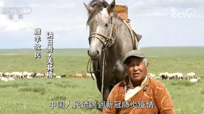赠羊牧民 讷日贵·关其格:今年春天,中国人民遭遇到新冠肺炎疫情,人民承受了身心健康威胁 。蒙古国总统怀着蒙古人乐于助人的善良心,前往中国捐赠三万只羊。得知(捐赠的)这个消息后我非常高兴,当时决心支持总统的善举,从自己羊群中挑选出了一些交给了国家,而且呼吁左邻右舍积极响应。蒙古国人民非常积极,我们很快就凑齐了三万只羊,蒙古人特别珍惜五畜,羊是很吉祥的动物。