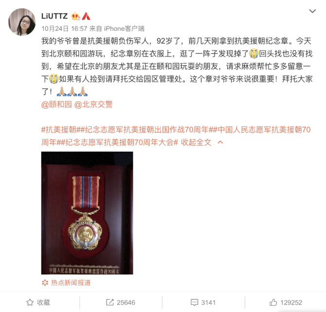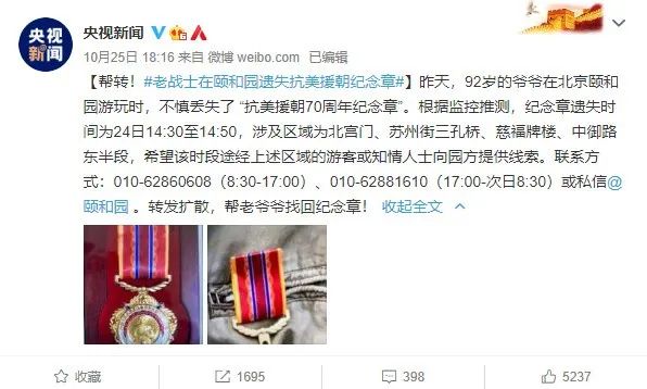 10月24日下午,92岁老人刘廷珠在北京颐和园北宫门区域遗失一枚“抗美援朝70周年纪念章”。老人的家属在社交平台发文求助后,迅速得到网友和媒体关注,一时间帮助老人寻找纪念章的消息被网友广泛转发。
