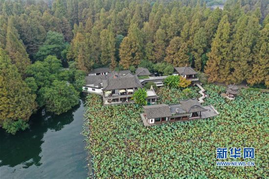 10月22日,游人在西湖小瀛洲岛游玩(无人机照片)。 近日,随着气温降低,杭州西湖初露秋色,显出迷人风韵。 新华社记者 翁忻旸 摄