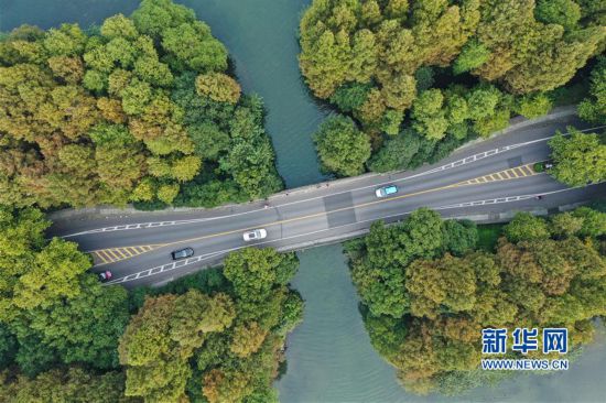 10月22日,机动车在西湖杨公堤上行驶(无人机照片)。 近日,随着气温降低,杭州西湖初露秋色,显出迷人风韵。 新华社记者 翁忻旸 摄