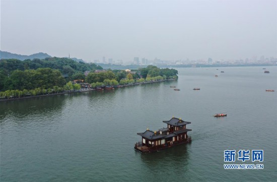 10月22日,游船在西湖上行驶(无人机照片)。 近日,随着气温降低,杭州西湖初露秋色,显出迷人风韵。 新华社记者 翁忻旸 摄