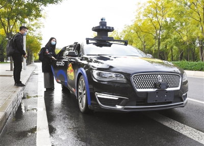 市民在北京市海淀区稻香湖路的百度自动驾驶出租车指定上车点乘车。新华社记者 任超摄