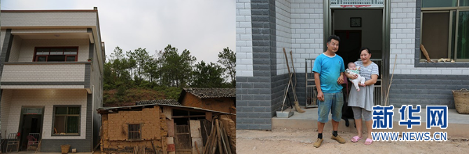 左图为刘伟坤新旧房子对比。右图为在新房子前拍的全家福。朱皓 摄