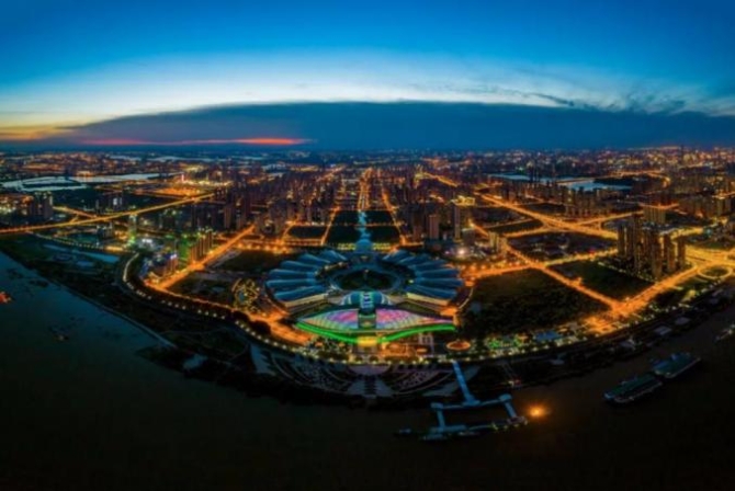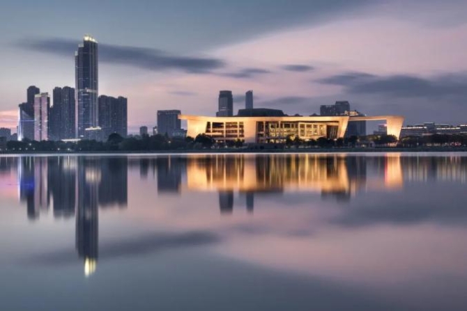 白天不懂夜的美,华灯亮起的流线型建筑,融化在月湖的夜色温柔。