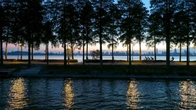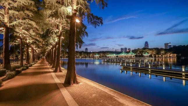 骑行东湖绿道,用力感受晚风,趁着夜色中穿梭在湖中。远处的水杉林静静地倒影在湖面,湖边的点点星光也渐渐连成一线,这样的风光与白天是截然不同。