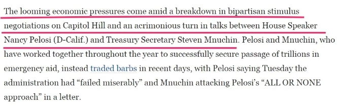 由于在救助规模和救助范围等问题上矛盾尖锐,谈判双方——代表民主党的国会众议院议长佩洛西和代表共和党的财政部长姆努钦日前双双证实谈判再告破裂,同时继续就此相互指责。