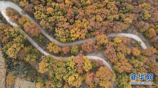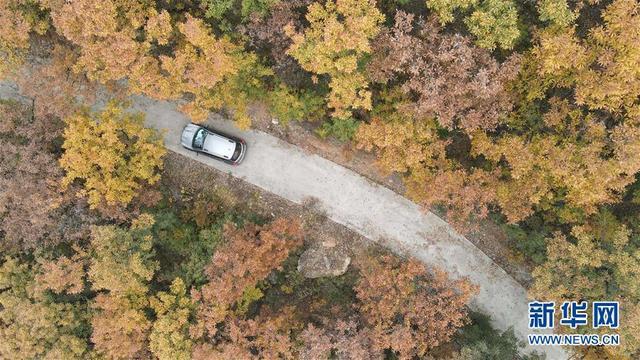 11月5日,一辆车在河北省邢台市信都区浆水镇前禅房村山间道路上行驶(无人机照片)。 河北省邢台市信都区浆水镇前禅房村位于太行山东麓。深秋时节,树叶五彩缤纷,梯田层层叠叠,山路弯弯曲曲,太行山区宛然成了一幅色彩斑斓的画卷。 新华社记者 骆学峰 摄