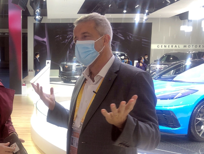 通用汽车中国总裁柏历在进博会讲解新车型。通用汽车已连续三届参展进博会。 新华社记者许晓青 摄
