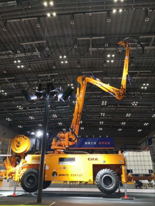 在3.1馆,一款橙色且高耸的机械,很吸睛。它叫喷湿机,是世界第一个双动力混凝土喷射机械手,在无法供电的户外或隧道内也可以自动发电,主要用于混凝土搅拌与传送。“它目前是折叠状态,但在3米多高的空间就可以展开,喷湿臂一次可滑移3.7米,每小时可喷射33.8立方米,比同类设备施工效率更高。
