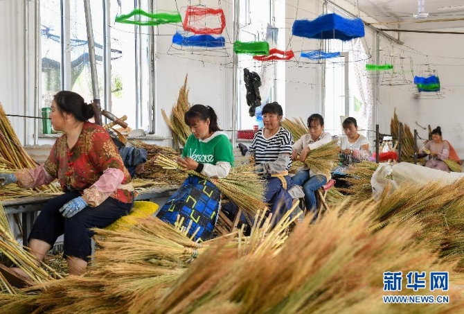 贫困户在巴林左旗林东镇扶贫车间内制作笤帚(2019年8月5日摄)。 新华社记者 彭源 摄