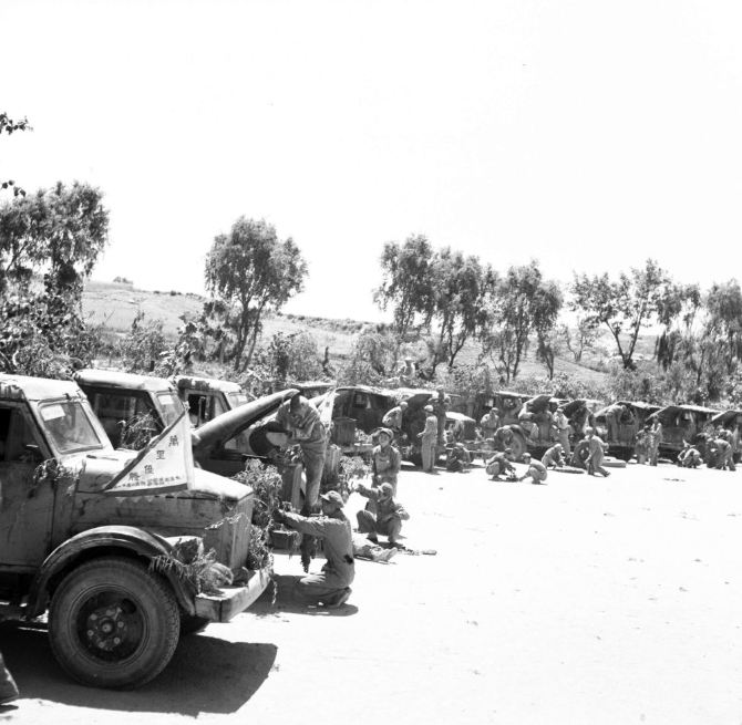 抗美援朝时期,中国人民志愿军运输部队克服一切困难,为前方运送各种物资。图为1952年6月运输部队的战士们在检查车辆。(资料图片)