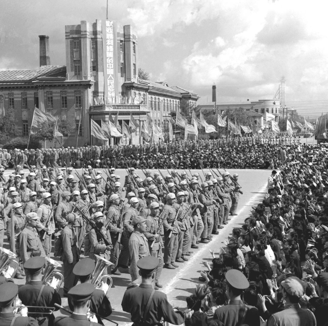 1954年9月20日,中国人民政治协商会议全国委员会、中国人民抗美援朝总会在安东市(今辽宁省丹东市)举行大会,欢迎中国人民志愿军归国部队。(蔡忠植 摄)