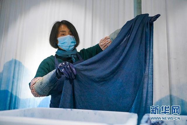 十堰市茅箭区茅塔乡东沟村由回乡创业人士开办的草木染坊染出的布匹。新华网发 刘建维摄