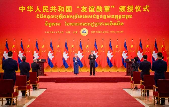 11月6日,习近平主席在人民大会堂为柬埔寨太后莫尼列颁授中华人民共和国“友谊勋章”。她也是“友谊勋章”设立以来第九位获得此荣誉的外国友人。“友谊勋章”是中国国家对外最高荣誉勋章。