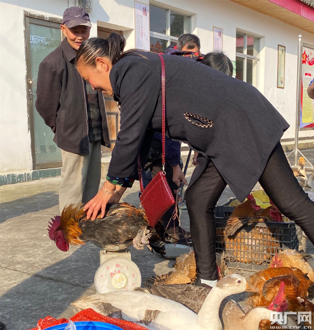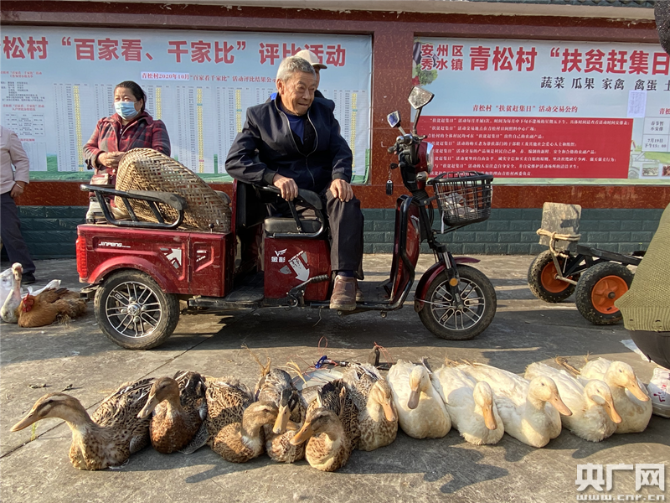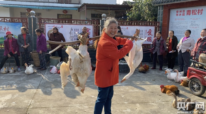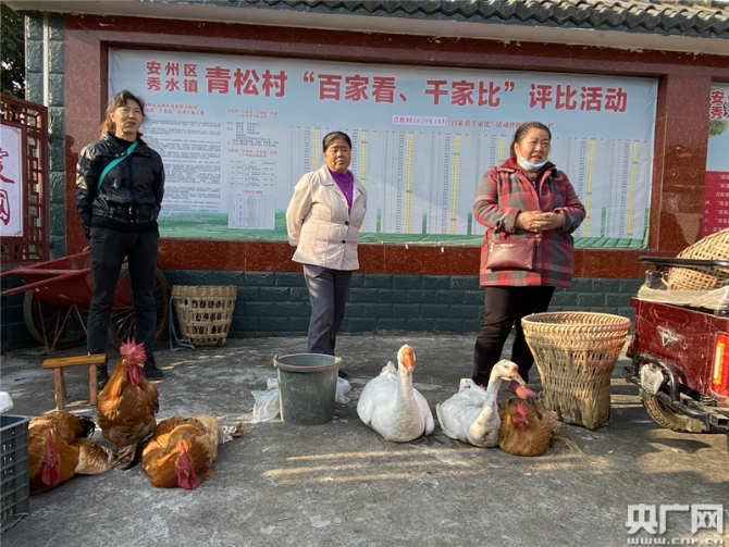 在四川绵阳安州区秀水镇青松村每月的“扶贫赶集日”上,村委会的大院里一派热闹的景象。村民们带着自家种植养殖的农作物和家禽来赶集,大院里地上各自成摊,打圈摆着五谷、各类蔬菜、家禽和活鱼,村民们说笑聊天,鸡鸭鹅唱起“和声”。院子里不时的走进购物的人群,这些人购物有个特点,一次购买量都比较大。不到一个小时的时间里,多位村民摊位上的农副产品就销售一空。青松村第一书记罗欢说,“像这样一次赶集,一户村民家的家禽起码可以给他们带来六七百元的收入,蔬菜能够带来两三百的收入。”这个扶贫赶集日深得村民的喜欢,每到赶集日村里有一种过节般的喜悦和热闹的气氛。