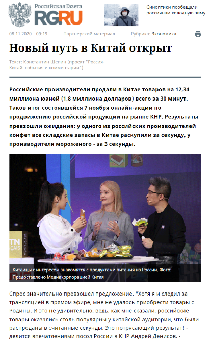 这是运用时下中国最高效的直播带货线上零售方式大规模在华销售俄罗斯商品的首次尝试。此次活动由中央广播电视总台和俄罗斯驻华大使馆共同举办。中国知名带货主播薇娅也受邀参与了直播带货活动。俄罗斯商品专场推介的5款商品全部售罄。