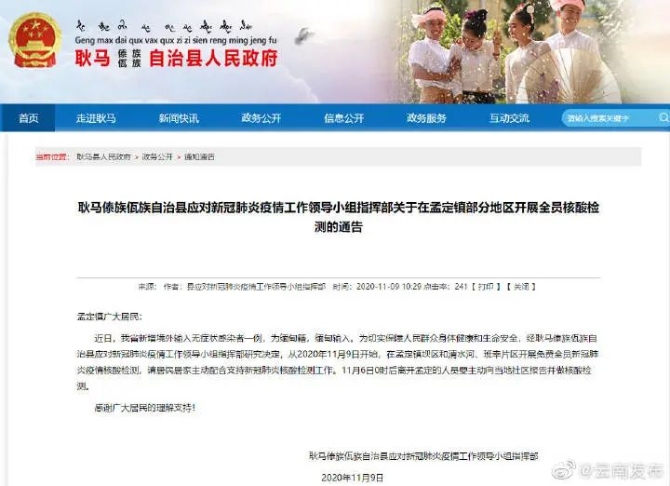 11月9日起临沧耿马孟定部分地区开展全员核酸检测