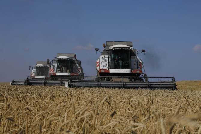 9月9日,在哈萨克斯坦阿克莫拉州图尔真村,收割机在收割小麦。(新华社发,奥斯潘诺夫/摄)