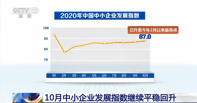 中国中小企业协会昨天(10日)发布数据显示,10月中国中小企业发展指数为87.0,比9月上升0.1个点,已升至今年2月以来最高点。
