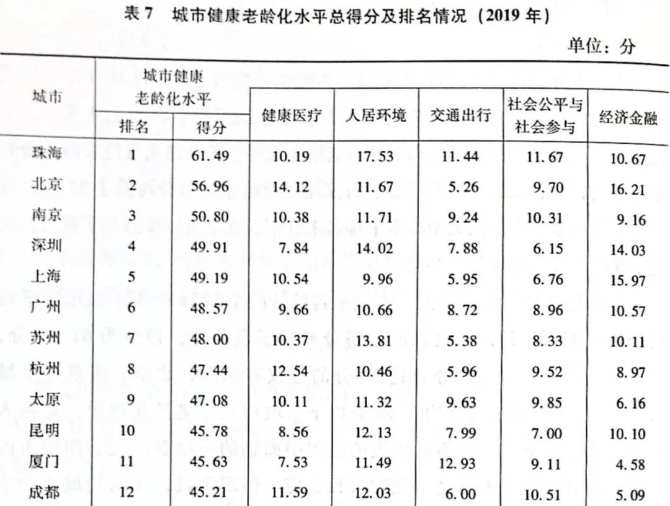 从此次报告的整体来看,珠海、北京、南京、深圳和上海的健康老龄化水平位于全国前5位,昆明位列第10。
