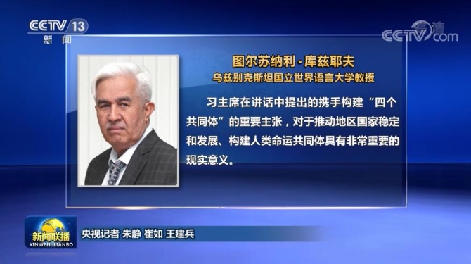 乌兹别克斯坦国立世界语言大学教授图尔苏纳利·库兹耶夫表示,习主席在讲话中提出的携手构建“四个共同体”的重要主张,对于推动地区国家稳定和发展、构建人类命运共同体具有非常重要的现实意义。