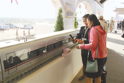 △中泰铁路合作项目一期工程开工仪式上,当地参观者拍摄中国“复兴号”高速列车模型