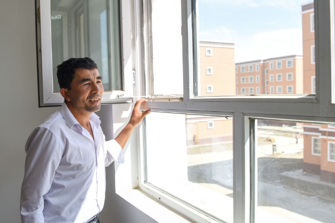 ↑ 新疆叶城县棋盘乡居民来到叶城县易地扶贫搬迁物流园区安置点查看新房(2019年8月19日摄)。新华社记者 丁磊 摄
