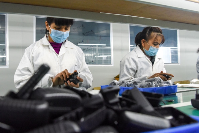 ↑ 在位于新疆策勒县天津工业园内的津和数字电子产业示范园区,员工在流水线上忙碌(11月4日摄)。新华社记者 丁磊 摄