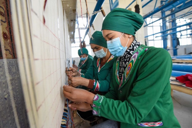 ↑ 在新疆洛浦县布亚乡欧吐拉昆孜村时代地毯厂,工人在制作地毯(11月2日摄)。新华社记者 丁磊 摄