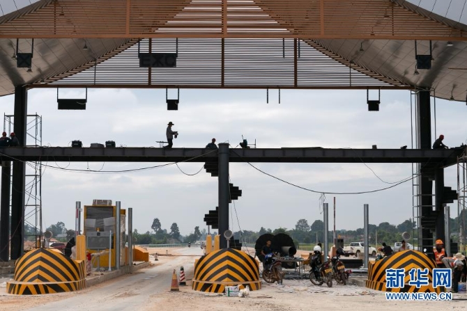 这是10月27日在老挝首都万象拍摄的建设中的万万高速公路万象入口。新华社发(凯乔摄)