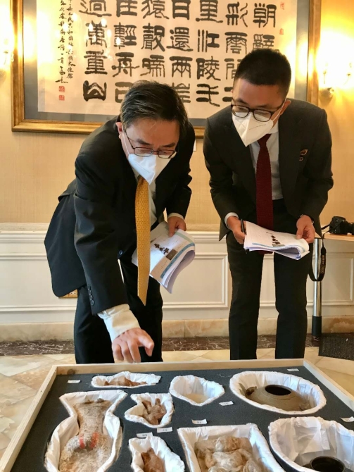 2020年1月,伦敦大都会警察局联系我驻英使馆,告知因购买人去向不明,且扣押时间超过追诉期,该批涉案文物被界定为无主物,主动提出希望将该批文物归还中国政府。国家文物局立即组织重启追索机制,拟定追索方案,组织专家鉴定,形成追索清单,基于联合国教科文组织《关于禁止和防止非法进出口文化财产和非法转让其所有权的方法的公约》(以下简称“1970年公约”),向英方发出追索函,代表中国政府正式提出返还要求。伦敦大都会警察局同意全部归还。10月19日,我驻英国使馆专人护送文物至伦敦希思罗国际机场,文物启运回国。