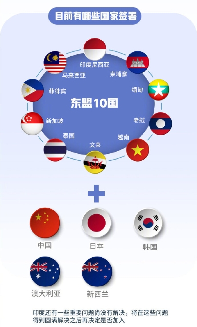 RCEP由东盟于2012年发起,成员国包括印度尼西亚、马来西亚、菲律宾、泰国、新加坡、文莱、柬埔寨、老挝、缅甸、越南在内的东盟10国与中国、日本、韩国、澳大利亚、新西兰。