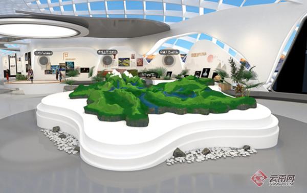 云南“云展厅”的入口处,一个立体的地形沙盘勾勒出云南的山川地貌,高原起伏,河谷密布,一块神奇而多样的土地,让人印象深刻。点击“VR云南”上面的交互热点,就可以看到“七彩云南旅游天堂”的宣传片和16州市著名景点的风光片。