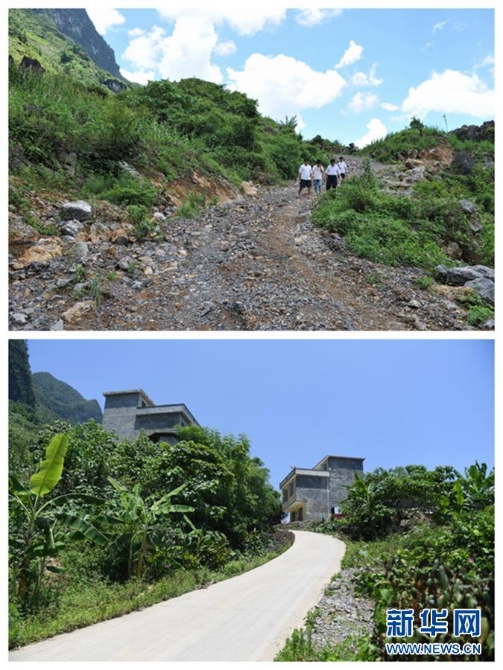 这是一张拼版照片。上图:已经修通水泥路的大化瑶族自治县板升乡八好村(2019年11月11日摄,无人机照片);下图:在尚未通路前,八好村村民背着年货走山路回家(2016年1月26日摄)。新华社记者 黄孝邦 摄