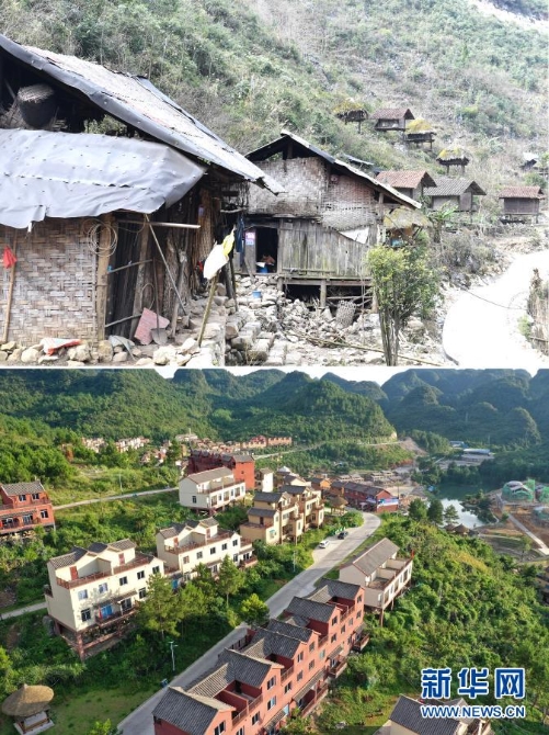 这是一张拼版照片。上图:整屯搬迁前的广西南丹县里湖瑶族乡董甲村么干屯(2018年1月10日摄)。这里的村民都搬迁到“千家瑶寨·万户瑶乡”里湖王尚易地扶贫搬迁安置点。下图:“千家瑶寨·万户瑶乡”里湖王尚易地扶贫搬迁安置点(8月4日摄,无人机照片)。新华社记者 周华 摄