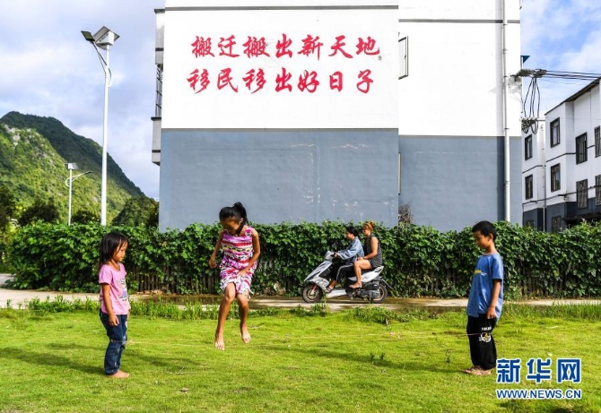在广西都安瑶族自治县下坳镇车家庄易地扶贫搬迁安置新区,小朋友在玩耍(8月18日摄)。新华社记者 周华 摄