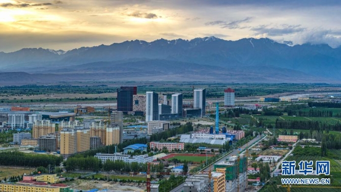 这是2019年8月9日拍摄的新疆阿勒泰地区青河县易地扶贫搬迁安置点阿格达拉镇。新华社记者 沙达提/摄