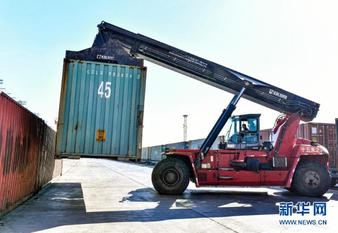 工人在中欧班列乌鲁木齐集结中心吊运货物(3月12日摄)。新华社记者 王菲/摄