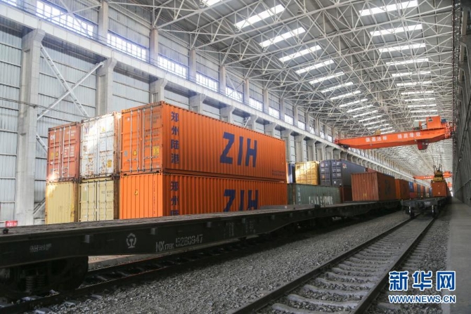 新疆阿拉山口站综合换装库(三区)内等待换装的集装箱(9月29日摄)。新华社发(于苏甫·艾尼/摄)