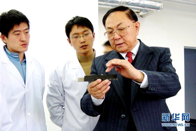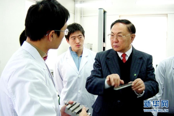 中国工程院院士、哈尔滨工业大学教授杜善义(右)为学生讲解复合材料(资料照片)。新华社发