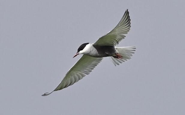 外形:中型水禽,体长31~39厘米。夏羽额、头顶、枕和头的两侧从眼和耳羽以上黑色。背、肩、腰和翅上覆羽珠灰色。后颈、尾上覆羽和尾白色,中央一对尾羽珠灰色。尾呈深叉状。冬羽头白色,头顶和枕缀有灰色,并具不明显的灰褐色纵纹。眼前有一小的黑色条纹,耳区有一烟灰色黑斑。后颈白色。