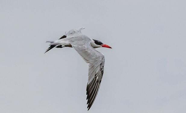 外形:一般体长63~72厘米,体重1500~2000克,体形大。嘴呈桔红色,嘴尖稍弯,上下点缀黑斑。成鸟头戴“黑帽”,背呈灰白色,腹及翼下白色,白眼圈,黑色的尾巴、黑色的翅膀。